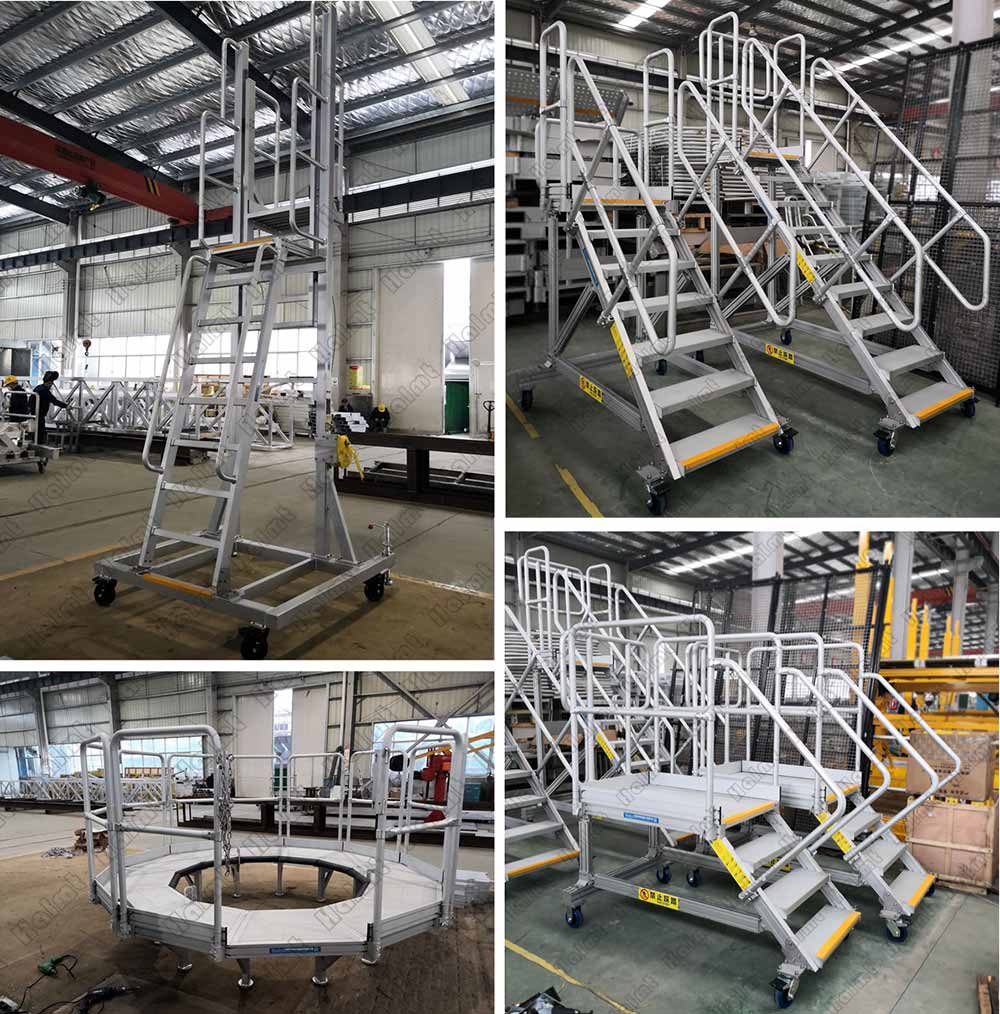 產(chǎn)品包括:多規(guī)格通用移動平臺梯、磁覆組上下轉(zhuǎn)子移動升降工作梯及前軸防護(hù)踏步圓形走臺。